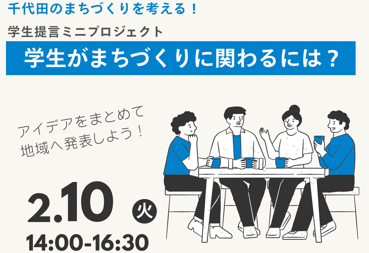 このたび、ちよだコミュニティラボ主催(千代田区地域コミュニティ醸成支援事業)、千代田コンソ協力にて、全2回の学生提言ミニプロジェクトを実施することになりました。