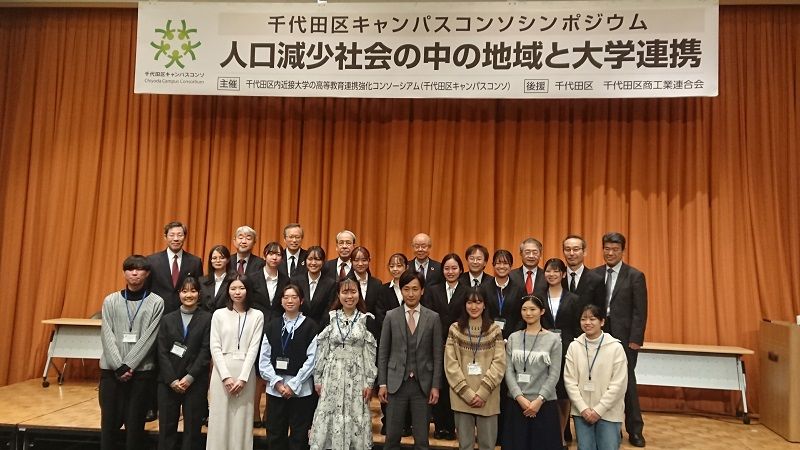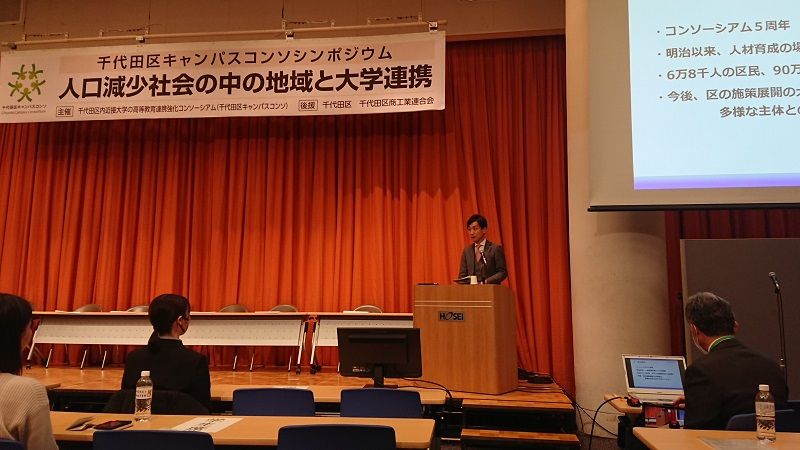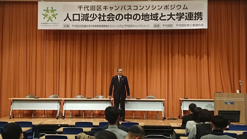 千代田区長の基調講演、学長等によるパネルディスカッション、千代田区キャンパスコンソの取組み紹介、学生による活動報告の4つのプログラムから構成されたシンポジウムは、人口減少・少子高齢化が加速度的に進展するなかで、持続可能な社会を維持・発展させてゆくことができる地域と大学の連携のあり方とその可能性を考える機会とすることを目的として開催したものです。