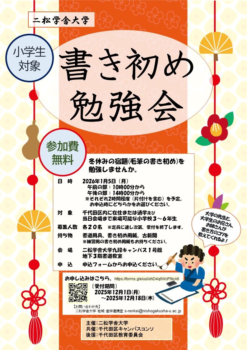 二松学舎大学では、千代田区キャンパスコンソとの共催により、小学生を対象とする書き初め勉強会を開催します。 大学の教員から、楽しく書き方のコツを学びましょう。 皆さまのご参加をお待ちしております。