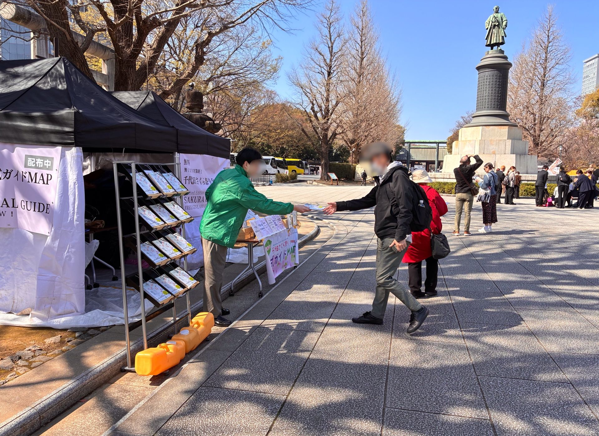 2025年7月より開始した「千代田さくら祭り2026公式ガイドMAP製作プロジェクト」に参加した学生が製作に携わった「千代田さくら祭り2026 公式ガイドMAP」が、区内各所で配布されました。靖国神社内の配布会場では、プロジェクト参加学生が直接配布を行いました。配布当日は、多くの方に足を止めていただき、街の魅力が詰まったガイドMAPをお届けすることができました。