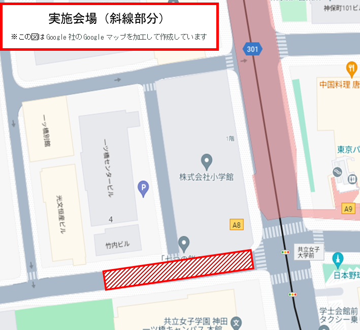 共立女子大学本館と小学館ビルの間の路上(白山通り側/地下鉄神保町駅A8出口前) 会場案内図はこちら