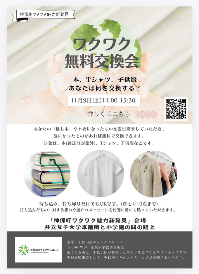11/9の土曜の午後に、「神保町ワクワク魅力新発見」と題して、神保町で居心地のよい場所・楽しく過ごせる場所を千代田区キャンパスコンソの学生が創ります。